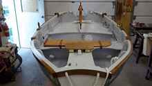 The seat just aft of the daggerboard case would appear to be where one would be sitting to row so it would be natural to locate the aft pair of oarlocks from the edge of that seat. Unfortunately you would have legs the size of Tiny Tim for this to work. Sit a box near a wall and decide how much leg room you need. My industrious friend in Oklahoma who finished his Sherpa ("Progress" ) way before we did told me that when he rowed his Sherpa he had to (due to leg space) sit on top of the daggerboard slot and that it was not very comfortable there. I am 6' and my friend is perhaps taller. One cannot sit on the middle seat facing the stern whilst rowing unless you have very short legs. I finally located the after pair of oarlocks using the 14" rule but with reference to a row seat that I made which plugs into the daggerboard slot. This row seat stores under the middle seat when not in use.