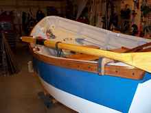 I tried to be careful to get the oarlocks in the right position. I had read various builders who located them with respect to the seat. An issue of Wooden Boats magazine, December 2009 had a special insert on rowing wherein it was recommended that the base of the oarlock should be located on a 14" diagonal from the aft edge of the seat. I discovered that for me and the Sherpa this would be another bigga mistaka!