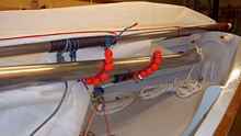 The port block is for the downhaul and the starboard block is for the halyard. This is per our Oklahoma friend's advise who rigged his Sherpa "Progress" likewise.