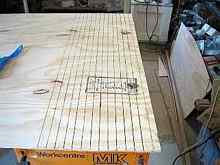 The next photos will outline the task of applying the base to the Aft Module. This is probably the most difficult part of the whole assembly, as Michael will attest to. It requires that the plywood be bent around a 45cm (18") radius at the transom. This necessitates the plywood be kerfed in order to bend this sharply. The drawings specify a 3mm (1/8 ") deep v-groove every 2 to 3 centimeters. In fact, Michael had to make them every 1-1/2 cm, and even then the task was challenging.