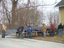 I wasn't sure how much the hull weighed at this point and got 14 people to help with the flipping. The hull lifted easily (16,17,18), came out the door, was rolled over, and put back in a few minutes.