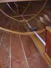 All the floors have limbers cut like the ribs. When they are all laid out and temporarily fastened with screws to the planking (at the laps to avoid going through the finished hull), you can test the fairness by placing a stiff batten atop them to look for high spots. Fine tune them, seal them and glue them in. The edges are cut back square 1" inboard of the third plank edge, where there will be a filler strip below the floorboard, riding on the lap seam.