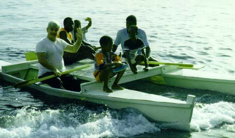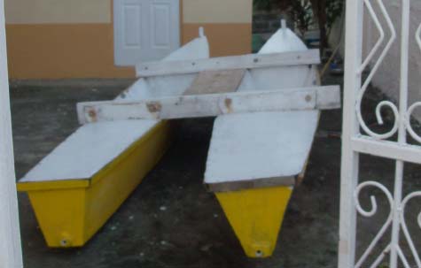 Present color and modifications are in yellow. Neither hull is as per original launch, and presently neither hull are the same dimensions!! We have taken it farther up the island than ever before, and thinking of a circumnavigation around SVG.