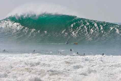 A big South Swell has arrived in SoCal from the deepest, darkest regions of the Southern Ocean below and west of New Zealand. This photo is from the Wedge in Newport Beach, CA and it demonstrates the power that can be generated at that very unique surf spot. We are seeing a solo kayaker paddling his butt off to scratch out over the oncoming lip. This is pretty hairy stuff as the wave looks to be running right around 18 feet, or so. The depth of the water where it will break is about 3-4 feet. Sources say he just barely made it. That carbon boat he is paddling would have been pummeled into sharp nasty splinters if he had been driven down off the lip of a wave that big.