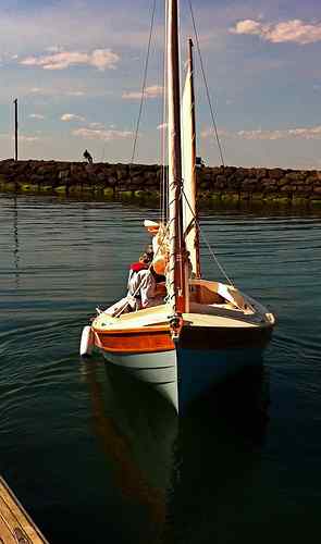 After an hour of sailing, tacking, gybing, and drifting we both decided we needed to shake out the reef and fly our full 100 sqft of balanced lug in all her glory. Maybe we'd catch a breeze or two and really go. There was a lull in the winds and I had my 11 year old move to the stern and I moved to the middle to help Amanda with the sail. We were sitting about 25 yards off the shore from the biker rally jamming out to the sound track of Easy Rider. The sail went up to her full glory and I was talking Amanda through tensioning the boom when we were hit broadside by a 15 mph gust and the sail suddenly fills. Amanda and Jacob are on the lee side and I'm on the windward side hiking out like it was a Laser instead of a Goose, the starboard chine was lifting clear, and I saw Jacob's foot was on the sheet. I hollered, "Jacob, lift your foot!" he did and the sheet and sail ran out and we quickly recovered.