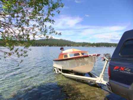After a 3 month spurt of adrenalin, I have a more or less restored-and completely modified-little stinkpot back in the water. I doubt she's been wet from anything but rain and snow in a generation. You perhaps know the drill. I was just going to test the trailer adjustments, to see how things look on the ramp with perhaps the bottom touching the water. Well, that went pretty good. So, then I was only gong to start up the motor and see how the throttle linkage and steering and fueling lines and electrical lines and all that motorboat stuff was going to work out. But, when I looked down at the lower unit to see if the tilt/trim had functioned properly, SHE WAS ALREADY FLOATING. We were simply captured by the guides that I had placed on the new trailer more or less by eyeball.