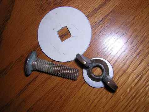 The wallowed out area can be built up with thickened epoxy and filed to fit the square flange on the brass bolt. Another way is to use a piece of metal, plastic, or fiberglass to make a small washer like plate in which a hole has been drilled, and then filed to fit the square flange on the backside of the brass bolt.