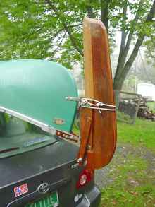 Finally when I got the rudder on I decided the canoe was a new boat. I painted her a shade of blue called "Greensleeves" and glued a hillbilly nameplate to her made of Lloyds Registered plywood. Besides her name and homeport, she carries the family motto of my wife's coal mining forebearers, "Onward if I am able" and a line of song. "Oh you New York Ducks, Can't you dance the polka."