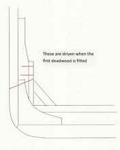 Looking at the bow, this seems like plenty of bolts in a small area. However I have to remind myself these sections of wood are huge by today's plywood and trailerable boat standards. The bolts which extended from the top of one member through another were pre-drilled. Those which extended into but not through a section were not pre-drilled. This was hard labor, not for the faint of heart.