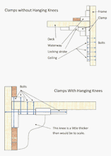 Clamps are long sections of planking which extend the interior planking, called ceiling, up to the deck beams. Clamps support the deck beam. Since on large ships the deck is a great stiffener for the hull, clamps must be strong enough. They will be bolted through to the outside of the hull. All clamp scarfs are positioned on the inside of frames, so that the outer edge of the scarf is covered. Normally the shipwright will use his longest timbers for the clamps.
