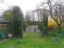 Access is difficult from a narrow lane, fortunately the church car park is opposite so I lined up the gates with this and made the doors 12' width to allow for backing the trailer into the garden. |