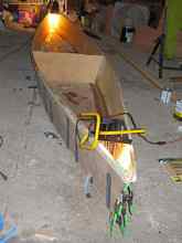 Once the resin was on, I had planned to added packing tape to the chines to keep the fabric tight against the wood. It turned out I didn't need to. That priming coat of thinned resin works wonders. Here's the resin curing overnight with a bit of heat underneath.