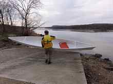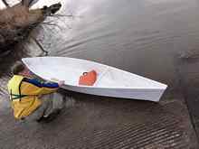 It appears to trim best in solo mode with the skipper's butt right on the fiberglass butt joint that marks the middle. This of course makes sense. With my 200 lbs in the boat, the stems are just barely immersed, which is good for top speed. (My bad "solo C" stroke is not.)