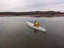 Potential refinements. I may add a couple more .75 x .75" skids on the bottom halfway between the keel and the chine for a little more stiffness. Another enhancement might be some crosswise 1x2 pieces glued and screwed to the inside of the bottom to stiffen the plywood where you side and keep your butt out of the cold water that finds its way in. I think you will definitely want a backrest thwart at any point where you are likely to need to rest your back. Perhaps one more thwart near the middle can serve as backrest for a solo paddler and the forward paddler, if the boat reverses direction for these two modes. However a moveable seat with a back might be the better approach, though this hull form does seem to be rather tolerant of bad trim.