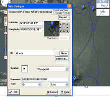 After loading this file to Google Maps, we can perform a screen capture (use your “Print Screen” key) and paste the result into Microsoft Paint. When saved as a .bmp, this is something we can import into GPS Utility. Once we load the bitmap, we need to calibrate it with actual map points. Double click two of the known points on the map, and for each one enter the actual coordinates and click “OK”.