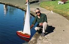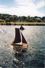 When my Starlet, still unnamed was complete, Roy presented it to me and added “It’s got all the bells and whistles’ to which I replied “That’s it Roy !  BELLS AND WHISTLES it will be !”  With her tan gaff rig sails of Jeparra cotton she looked resplendent on the day that we officially launched her at Onepoto, and he had carved out of balsa and beautifully painted an Ancient Mariner helmsman with the name of Charlie Breeze which he insisted “even looks like you !”