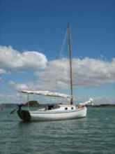 I had planned to be away sailing on 24th Jan, thats 3 1/2 weeks from when I drew the lines for what is now called "Offcuts" but without much of an effort I was away to the lake in the middle of town on the 18th. It was without a doubt the launching with the least ceremony that I've ever done, simply picked the 42 lb boat up off the trailer in one hand, the oars in the other and walked down to the waters edge and pitched it in, standing on the painter to stop it driftng out of reach.