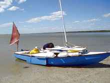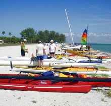 We got to Ft. Desoto on Thursday and made sure to get a good night's sleep. On Friday, we sailed Oaracle from the park's launching ramps to the starting beach so John could get a feel for the boat. Robert Terry from Bradenton, a future hopeful EC participant who would store my pickup and trailer for us during the race, also came along. It was John's (and Robert's) first time on Oaracle and the first time I had sailed to the start rather than taking the boat to the beach on a trailer. There were light winds at the ramp that freshened as we sailed along and provided an exhilarating broad reach by the end of the sail. We beached and with some help hauled the boat above the high water mark.