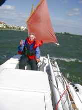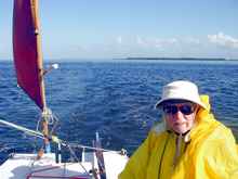 John steers with a double reef in the main as we leave the beach.