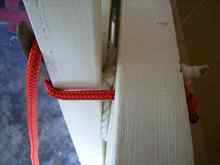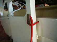 Whipped up a small jam cleat & screwed/glued to back of main ladder frame, drilled hole in transom near ladder rope hole & fitted 6mm rope of appropriate colour with figure 8 knot on end. When ladder is folded against transom, the white ladder rope forms a soft buffer so no need for bungee to keep enough pressure on ladder to stop rattling. If the red rope comes loose while sailing, so what!.... the ladder will simply trail until you re-cleat it. The pics show it all.