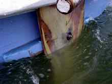 The original leeboard is 47 inches long and tapered from 9 inches wide at the top to 7 inches wide at the bottom, and is ¾-inch thick. An examination of the mounting brackets, especially the upper leeboard guard, showed that the board would be widened by about 3 inches without having to modify that upper guard, as long as the extra width was added to the forward side of the board. (I didn't worry about what this would do the the balance under sail since it should shift the balance point only an inch or so, and it would be shifted forward which would help the slight lee helm I get in lighter winds.) There also was enough clearance in the upper guard to make the board a tad thicker, if desired.