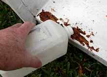 Next comes the epoxy. The goal is to saturate all of the affected wood right up to the good wood, which is why holes are drilled right up to and a little over the boundaries of the rotted areas. The epoxy is poured into the affected area, and a small brush spreads it and pushes it into any nooks and crannies. On the rubrail, some of the drilled holes were pretty deep, up to an inch or so. For those, a small syringe was used to inject epoxy into the affected areas. The rotted wood will soak up a lot of epoxy - a good thing. Several "injections" were needed on the rubrail. It is not necessary at this point to fill the affected areas with epoxy, but also don't scrimp. The goal is to saturate all the wood fibers in the affected area, from top to bottom, with resin.