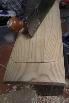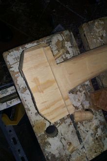 After gluing the parts of the back together the paddle was given a bit of external shape. I went fairly close to the final shape I was after in the blade but, as you may see later, it was mainly so I had a fair clue on how much to hollow out of the centre and then so I could know how much I could take off when doing the final shaping. I really should clean the sole of that plane a bit better.