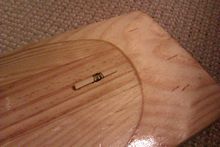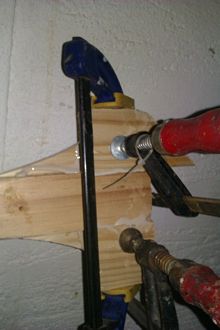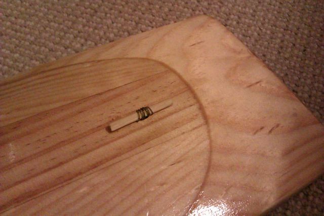 STOP. Don't glue together now like I did – remember to seal the inside surfaces of the sound chamber as getting a brush in there afterwards is nigh on impossible. Then glue together (note the nail stopping things from sliding around). After gluing together finish off the shaping of the blade. The small hole is where the strings feed through to be tied to a short piece of a thick bamboo BBQ skewer. The strings will be held in alignment on the bridge by notches.