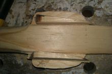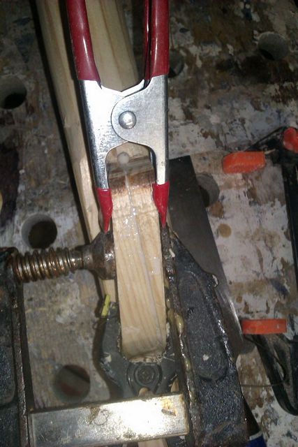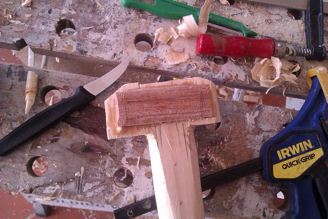 I rebate planed out some of the original wood so I could laminate in some wood in with the grain in the strong direction. Note the potato peeler that I was using as a finishing spoke shave on the shaft and the Victorinox shaping knife I bought at a kitchenware store.