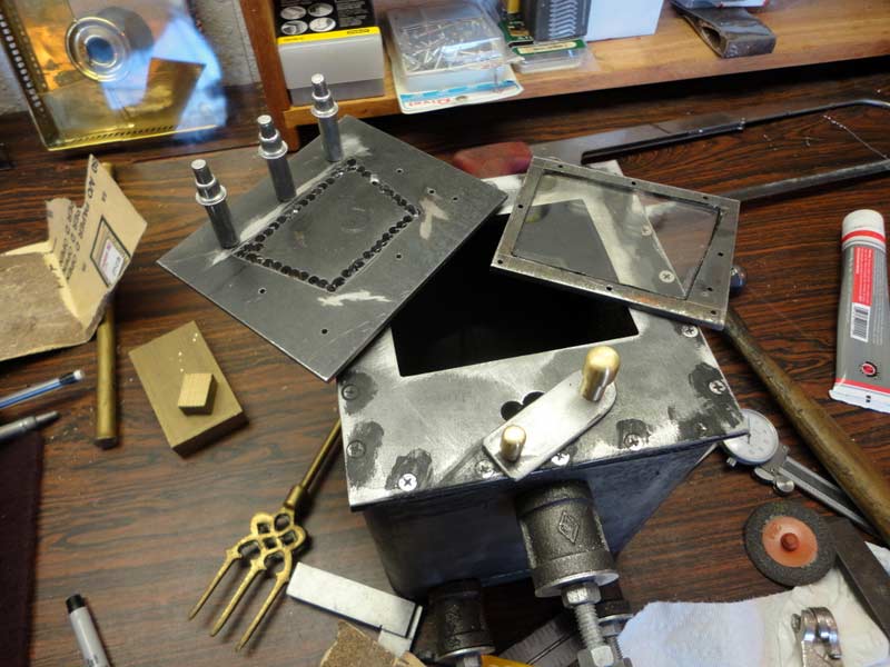 I made a frame from mild steel the same thickness as the glass, and sandwiched it between an inside frame, and the door itself (see test result at the end of the article). The door is larger than the stove opening by ½ inch all around. The glass frame, and rear frame are the same size as the stove opening. The openings in the door and the rear frame are slightly smaller (about 1/8 inch all around) than the glass itself. The rear frame is drilled and tapped to accept 6-32 screws, and the door and glass frame were drilled larger so the screw threads cleared. Before assembly I smeared it all up with stove cement.