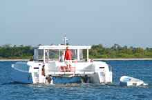 I had last seen her in 2002, and feared Ted and Patty had "swallowed the hook", as so many folks do at a certain age. Then one evening, after I had just described Ibis to a couple from a Gemini cat, a sleek motor cat pulled in and anchored between us. Sure enough, it was the re-incarnated Ibis! I had not seen them because they had been down in the western Caribbean (Belize, Honduras) for years. After that adventure, they were feeling less ambitious about their sailing plans, and less able to handle the big rig. But they still wanted to putter about Florida's west coast. So at very little expense, Ted took the rig down, built a hard top for the cockpit, and added a second sled and 4 cycle outboard motor. Now he has a terrific power cat that can fit under the many bridges along the ICW! Ibis can spin in place, and with her shoal draft, squeeze into the many cozy mangrove anchorages along the coast.
