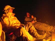 Just after he and Stan reached Mustang Island, Pehr contacted us by radio and gave us their position. Stan said he would try signaling us with his strobe so we could locate them, but we couldn't see it due to the dense fog as well as being over a mile away. We made plans for them to join us on Shamrock Island the next day.  We put the tent up and I cooked macaroni & cheese with corned beef. It was really nice to have a hot meal as we had gotten pretty cold while wading the boat around. Major, very hungry from all that shivering and barking of orders, ate nearly his weight in  dog food before setting upon the crew's leftovers. We turned in for the night, too tired to make a camp fire or stay up to greet the new year. Over on Mustang Island, Pehr cooked up a great meal of curried salmon. Stan, Pehr and  Sammy built a nice campfire on the beach with Presto logs and toasted the New Year with cold champagne and great conversation. Pehr and Sammy set up a tent on the beach while Stan rigged a boom tent on Spartan and camped aboard.