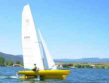 My regular perusal of catamaran classifieds turns up an 18 square ridiculously cheap in San Diego. A class racing boat from the 80's, it's 18 feet long, 11' wide, with a monster mast, 35' tall. Another light air machine. That lust that I seem so susceptible to, develops once again! I surely don't need another boat, but this is one I've eyed for years, and here was a great opportunity to see if it'd be as much fun as I had imagined. So I scan about for a partner. Not that hard to find. My regular crew and landsailing/iceboating guru, John, has been thinkin' that he might be needing a cat of his own so he doesn't have to drive that 10 minutes south to fly with me. He ponies up the purchase price, and I arrange and finance the craft's journey north. Yippeeee! A new toy! John hacks up a boat lift to adapt it to the wide beam, and she has a new home in Lakeside. I now have a ride there at mid lake, Flight Risk 10 miles further south at the cabin in Rollins, with High Voltage on Dayton Bay another 10 clicks to the south and west. Which is the bay with the magic wind!