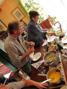Brian took us all back to his home where we were soon gathered around his dining room table for a delicious meal of hearty soup, French cheeses and a seemingly endless supply of crusty baguettes. With impeccable timing, our next illustrious explorer, Albert Marshall, a former Brit now residing in Brittany, arrived with a Bolger Pointy Skiff in tow just as we were sitting down for lunch