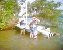 So I decided to build the spars from wood, purchase necessary hardware from my favorite Chandlery (Duckworks of course) and give everything a couple coats of epoxy and varnish. Now for the rigging, I had the plans but there's always more than one way to skin a cat so I found The Monies on Sail Oklahoma's website with a ton of great pics of Jackie's flawless Kiwi. Dave Gray was also very helpful with rigging the sail of course. Numerous questions were answered on the forums and everything finally fell into place on May 22nd 2011. After 35 years the Boy Scout found his way back at the helm. I may not have had the biggest boat on the lake but I had the biggest smile guaranteed. After a couple hours on the water we got much better at maneuvering around and were able to make a stop at one of the islands for a sandwich and a cold soda.