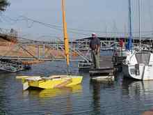 Before heading out on the lake I went over to the dock to scrounge a PFD off of my Compac Suncat which was parked forlornly in its slip. Its wide comfortably padded seats glared at me accusingly since I had chosen a thin pad in a tiny flashy yellow boat over them. While I was doing this, the designated witness to the first sail and my rescue boat showed up in the form of John Bell and his lovely Core Sound 15. John became a legend in the Everglades Challenge for his determination in singlehandedly launching an O'Day Daysailer 2 off the beach. I think that experience got him to sell the Daysailer and buy the CoreSound. He snapped some pictures of me and my new boat at the dock.