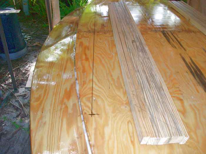 The slats were made from yellow pine. They were cut out with the 15 degree angle on both sides leaving them a full 1 ½ inches wide in the center. The bottom of the boat is ¾ inch thick so I just used deck screws and titebond III glue and screwed them one on top of the other. I cut the leading and trailing edge off at 45 degrees. Rounded over the edges and epoxy glassed them onto the boat. I figured if the whole thing didn't work out, I'd just get the saws all out and start over with the leeboard.