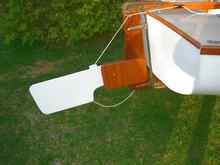 And so I set about modifying her existing rudder by cutting off the "fixed blade" portion, and shaped a new rudder blade cut from a piece of 3/16th marine grade aluminum sheet, fabricated a set of rudder cheeks and a pivoting mechanism, including provisions for up- and down-hauls. The resulting rudder blade area is about 15% smaller than the original due to a miscalculation on my part when I ordered the aluminum plate from which it was cut. I have yet to launch her so cannot comment on the effectiveness of this new rudder, but I remain optimistic...