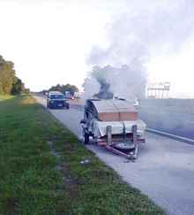 Wild Duck goes up in smoke at the north end of Florida’s Turnpike about three hours into my trip to Oklahoma. This photo was taken shortly after a Florida Highway Patrolman exhausted his extinguisher in an effort to put out the fire.