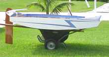 Here is the finished hull loaded on my wheelbarrow/boat cart ready for rigging. Note her gently curved sheer.