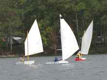 In this photo, Ryan is battling with Michael Storer in the white boat with the lug sail on a downwind run. Ryan was able to outsail Michael on this downwind run. In the background is eventual winner Shawn Payment.