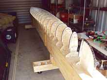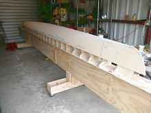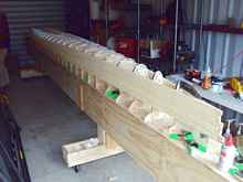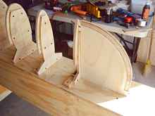At this point in the process it was time to start tackling the forms. Skip provided me with drawings of all the stations, and I also asked for a cad file. My daily life is CNC machining and I thought about machining all the forms, but opted to use the bandsaw and sander to make them. Everything was drawn out on the plywood and I began the process of making my stack of forms that would turn my 2d project into a 3d reality. Once installed on the strongback, a beautiful skeleton emerges.