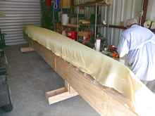 We also pulled out the fiberglass and cut it to length, then set aside. When we were ready to start with epoxy, we rolled half of the Kevlar back on itself and coated the foam with epoxy. The Kevlar was carefully pulled back in place and we pulled the other half back and epoxied the other half of the boat. Once the piece was all spread out over the core, we carefully worked the fabric down the way we wanted and started to spread epoxy on the entire outside. Once coated, we used spreaders to even everything out.