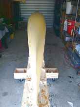 When sanding the outside of the hull to get everything faired out correctly, I got a little thin on both the bow and stern about 1-2 feet from the ends. To help with this I did two separate pours of epoxy and wood flour.