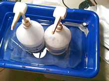 To help with any mess during gluing, I masked off the outside of the hull just below the top edges. The Texas heat had really kicked in by this point so I got a very early start. I arrived at my shop about 5am and got everything ready to go. To combat temperature issues later, I got bags of ice and had them in a cooler. I put my epoxy in a container with water and slowly added ice. Note the thermometer in the corner of the tub.