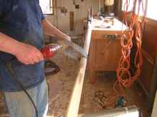 I usually use a block plane for this last rounding. If you are particular about perfection, use an inside-out sanding belt chucked up to a power drill (P35). |
