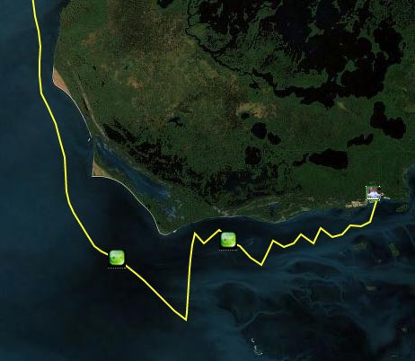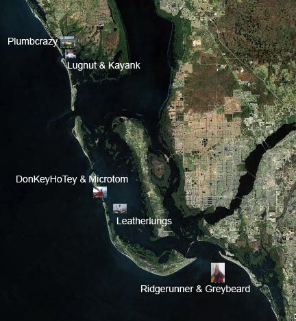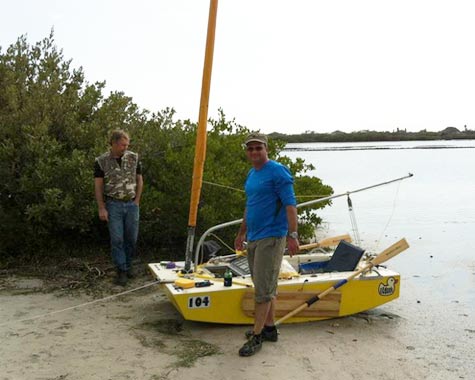 Posted to Watertribe forum by Doug "Ridgerunner" Cameron: "We pulled into the bay at Middle Cape to heave to and reef. We had been speeding down the coast at 7 and 8 mph, often planing, in 15-20 mph winds. All of a sudden the wind went E from NE and went to 40+/- (according to park headquarters) and knocked the boat down. The mizzen was sheeted in hard and the main was unsheeted. The main dug into a sand bottom and sheeted off as we climbed onto the centerboard to right her. By the time we got her bailed and the main spars and sail back on board, we were west of the IVW headed for Mexico. So we told the Coasties what was going on, rigged the midden midshipd, and sailed slowly throu breaking waves to the beach. The Tow Boat US folks wouldn't come out in the wind, but they will try in the early AM when the winds may lay down. We are driving to Tampa to get the truck. Christie and Noel, checkpoint captains at Flamingo are great."