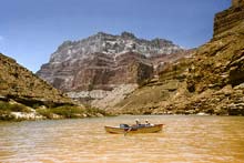 Ten miles downriver we come to the Little Colorado River, which pours into the Canyon on river left, 62 miles from our launch point at Lee's Ferry. The Colorado flows south here, and the rocky butte of Cape Solitude towers 3,400 feet above the Little Colorado's south bank. A band of cliffs 1,500 feet high line the northern shore. And in between flows a stream whose bright turquoise water wouldn't be out of place in the Keys or the Bahamas. It's a striking contrast to the Colorad's greenish waters. Before Glen Canyon Dam, when the Colorado ran red more often than not, the contrast would have been even greater. the two rivers used to run side by side for a long time before mixing, one a deep red and the other a startling blue.