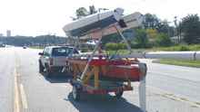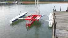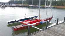 I had a new boat launch on 9-3-12. It is a homebuilt racing trimaran made with Isotope catamaran parts. The center hull is 20 foot long and made as close as I could to match the shape of the Isotope hulls and is made from ply and glass covered. It is 14 foot wide and weighs right at 335 lbs. First sail was encouraging in 8-10 mph wind my top speed for the day was 9.4 on the gps and I covered 10 miles. I can paddle it with a single blade at 3 mph pace. Testing will continue and I hope to have it ready for the Watertribe North Carolina Challenge on Sept 28th.