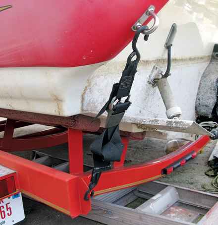 Production boats/trailers tend to come with a short strap that runs from the trailer's corners up to an eye on the top corners of the transom, making strapping down quick and easy.